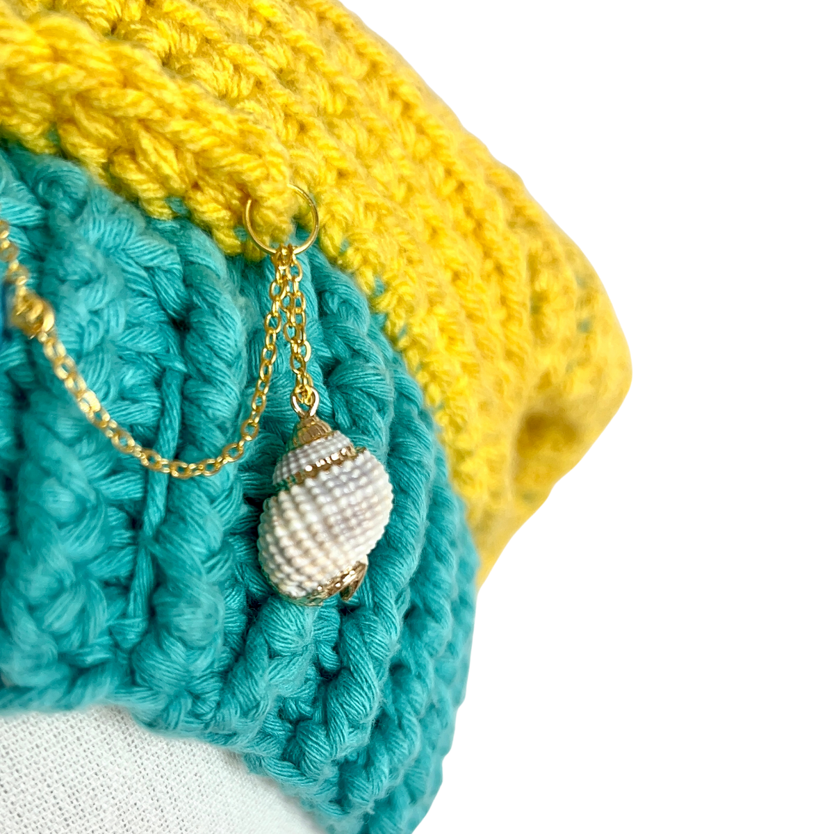 Il cappello è realizzato a mano con filato 100% cotone e conchiglie.