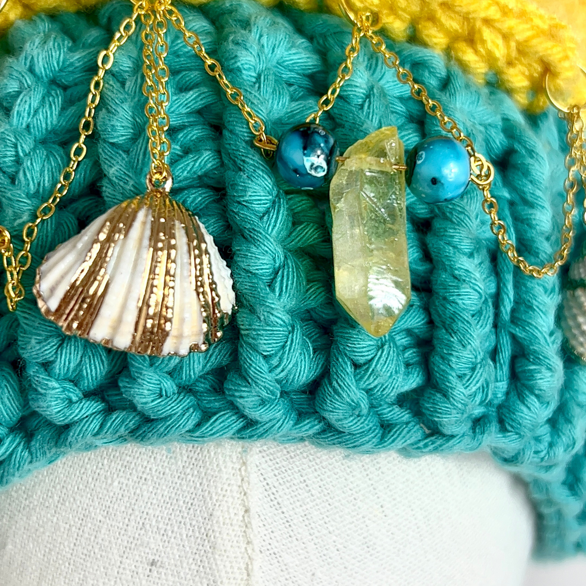 Cappello di cotone – Acciaio dorato – Conchiglie naturali – Cristalli – Pietre dure.